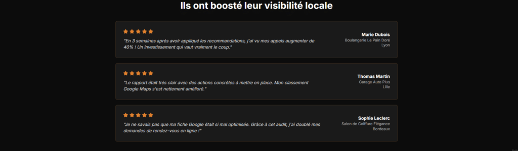 Grâce à une analyse détaillée de vos informations, catégories, photos, avis, cohérence NAP et optimisation locale, LocalPulse vous montre exactement ce qu’il faut corriger pour améliorer votre positionnement sur Google Maps, augmenter vos appels, et générer davantage de visites en magasin ou sur votre site.